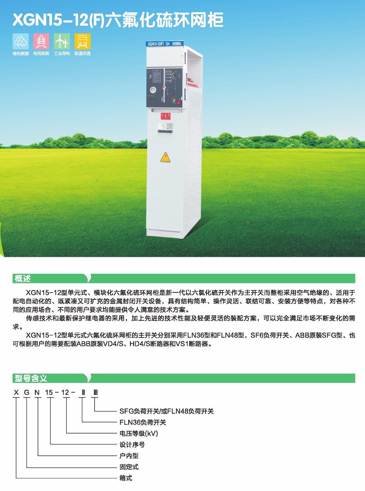 XGN15-12型單元式、模塊化六很化硫環網柜是新一代以六板化硫開關作為主開關而整柜采用空氣絕緣的、適用于配電自動化的、既緊湊又可擴充的金屬封閉開關設備,具有結構簡單、操作靈活、聯結可靠、安裝方便等特點,對各種不同的應用場合、不同的用戶要求均能提供令人滿意的技術方案。