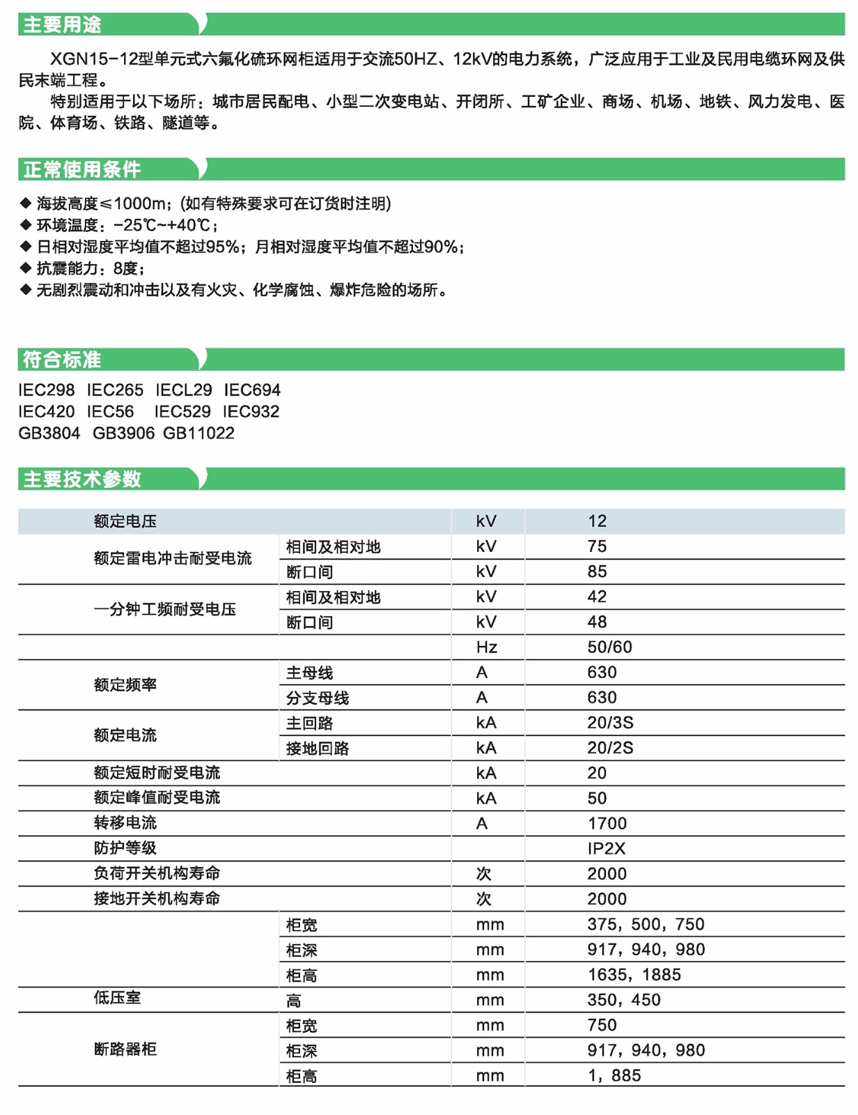 XGN15-12型單元式六奴化硫環網柜的主開關分別采用FLN36型和FLN48型,S F6負荷開關、ABB原裝SFG型、也可根據用戶的需要配裝ABB原裝VD4/S, HD4/S斷路器和VS斷路器。