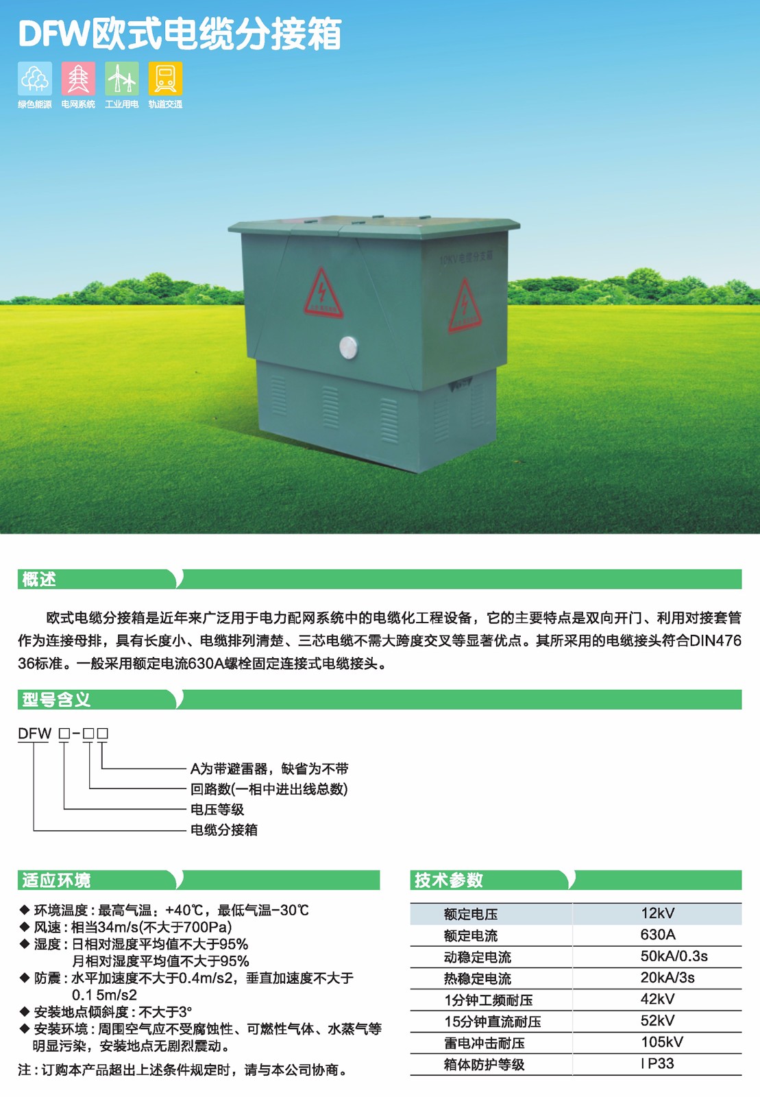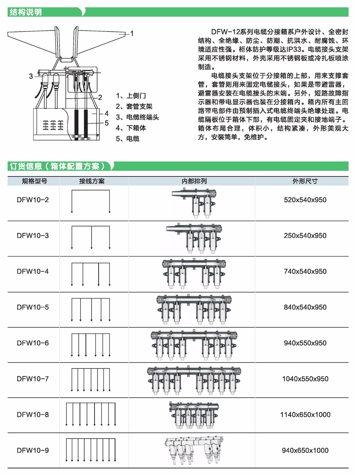 DFW-12系列電纜分支箱系戶外設(shè)計(jì)、全密封結(jié)構(gòu)、全絕緣、防塵、防潮、杭洪水、耐腐蝕、環(huán)境適應(yīng)性強(qiáng)。柜體防護(hù)等級(jí)達(dá)IP33。電纜接頭支架采用不銹鋼材料,外殼采用不銹鋼板成冷扎板噴涂制造。電纜接頭支架位于分接箱的上部,用來(lái)支撐套管,套管則用來(lái)固定電纜接頭,如果是帶避雷器,避留器安裝在電纜接頭的末端。另外,短路故障指示器和帶電顯示器也裝在分接箱內(nèi)。箱內(nèi)所有主回路帶電部件由預(yù)制插入式電纜終端頭絕緣處理。電纜隔板位于箱體下部,有電纜固定夾和接地端子。箱體布局合理,體積小,結(jié)構(gòu)緊湊,外形美觀大方,安裝簡(jiǎn)單,免維護(hù)。